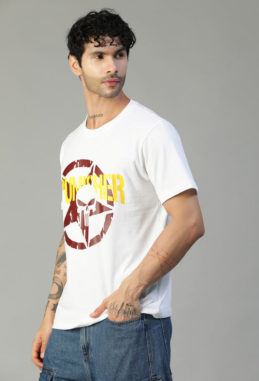 Offer Price Rs. 379Rs. 579 MRP Rs. 699SaleThe Punisher Premium Design Print White Regular Fit T-Shirt