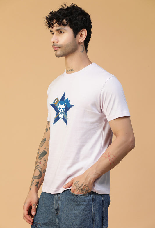 Offer Price Rs. 389Rs. 589 MRP Rs. 799SaleOne Piece Anime Design Pirate Symbol Regular Fit White Printed T-Shirt