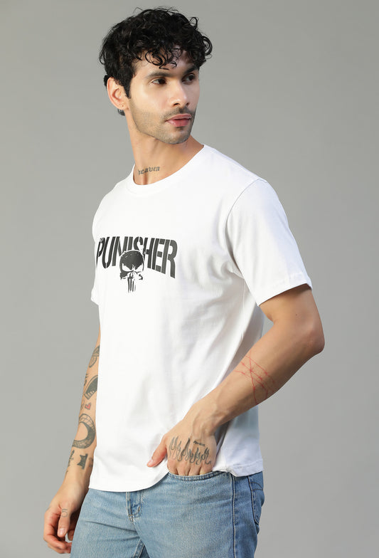 Offer Price Rs. 389Rs. 589 MRP Rs. 729SalePunisher Text Printed Regular Fit Printed T-Shirt White